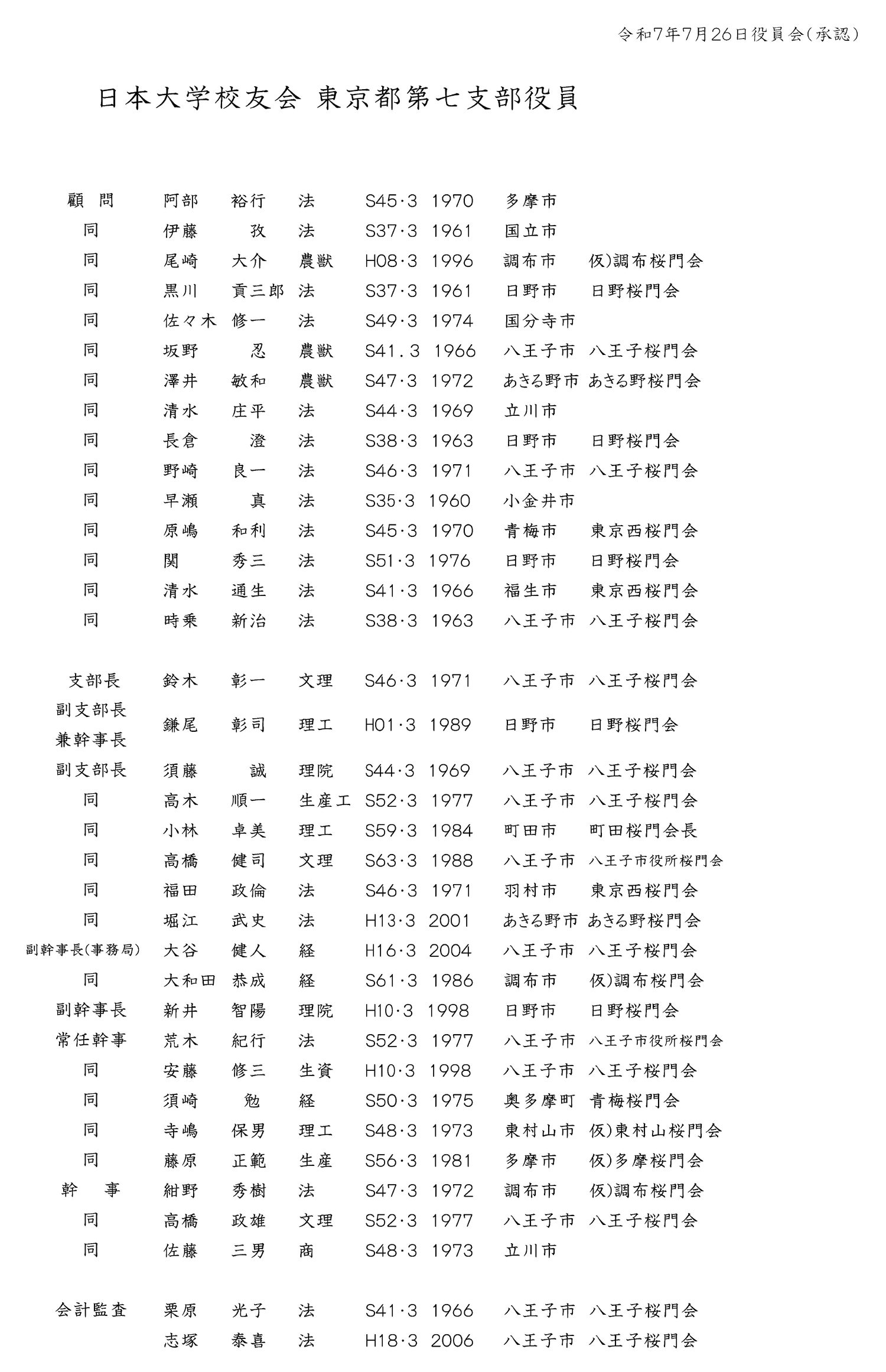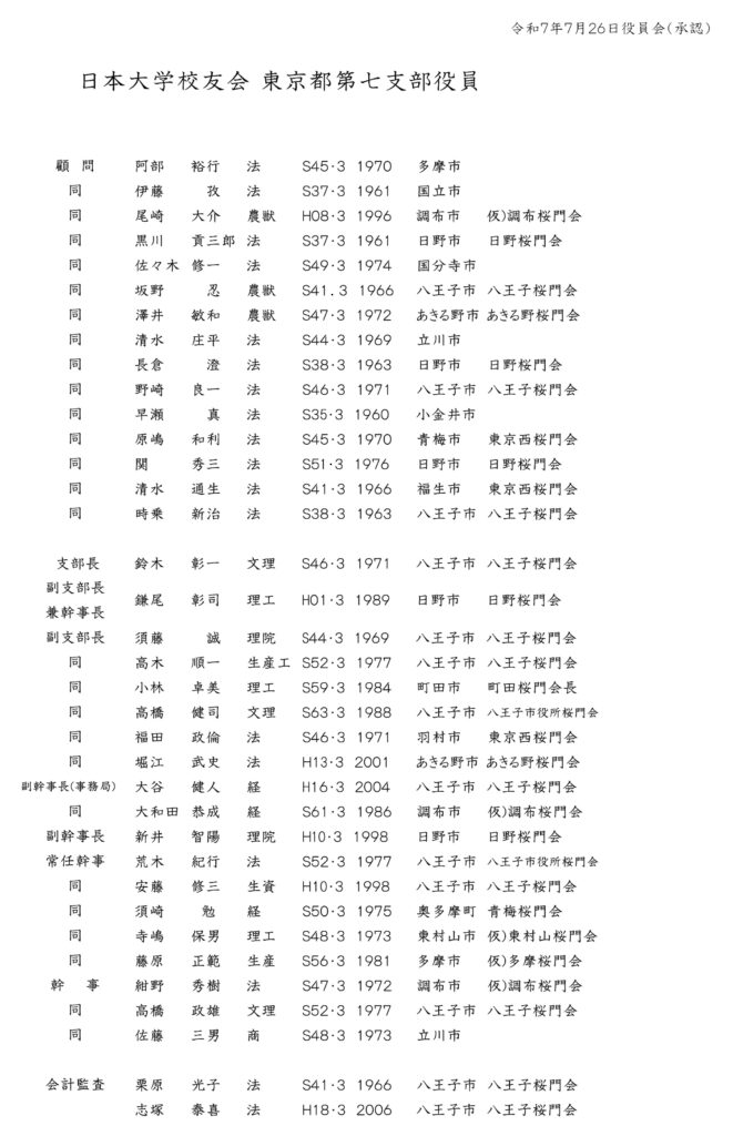 日本大学校友会 東京都第7支部 支部長: 鈴木 彰一 幹事長: 鎌尾 彰司 TEL:03-3259-0667(勤務先) 事務局: 大谷 健人